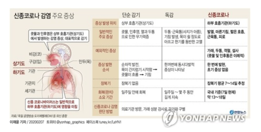 곰곰이 생각해보니, 감기 증상과 코로나 증상의 구분이 쉽지 않을 것 같아 연합뉴스 자료를 이용해 코로나19와 감기의 차이점을 정리해봤습니다.
